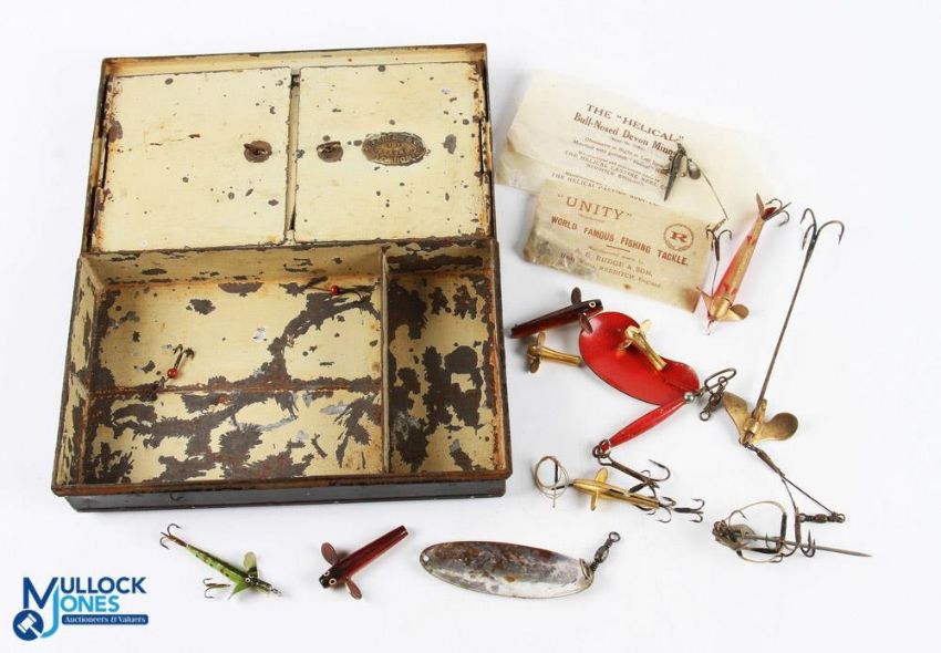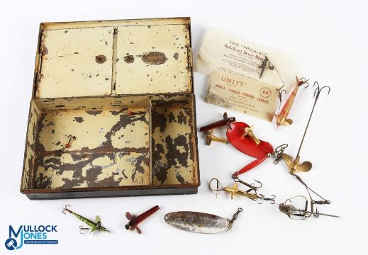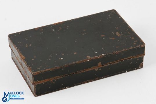 C Farlow Black Japanned Fly Box and Lures with two hinged door compartments to inside with oval Farlows plaque, with a small selection of mixed lures inc Farlow spoon, Allcock spike bait, Helical Minnow, A E Rudge lure in packet etc
