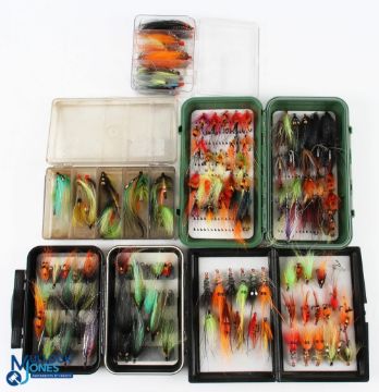 Collection of approximately 100 salmon flies, comprises 9 Shrimp patterns, 10 tube flies, 16 assorted flies with red/black heads, 15 double hook flies, some with Jungle Cock and 47 double hook flies in various patterns, comes in 5 fly boxes by Orvis, CF Design and others.