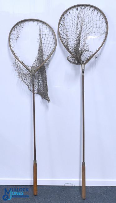 Landing Nets: an early Farlow wooden Gye trout net marked C Farlow & Co, London, plus a similar net unnamed, both with brass fittings and hardwood poles, the nets show signs of wear with large holes (2)