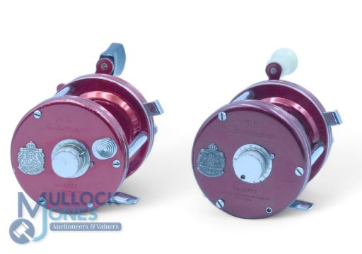 Two Abu Ambassadeur multiplier reels, a black handle model, with grooved 3 screw end plates, star drag, level wind, foot stamp 100902, in maker’s leather case with tools and oiler plus an early white handle model, level wind inoperative, so needs attention but fine condition, in leather case with tools and spares.