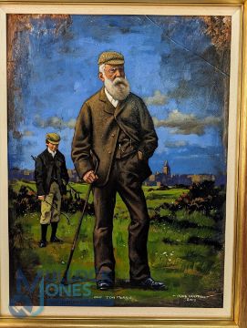 Craig Campbell Golf Artist: Old Tom Morris, with his caddie and St Andrews skyline in the background, a fine original oil on board painted in 2008 to mark the death of Tom Morris who died 1908; signed by the artist lower right, well framed in a gilt frame - size #24 x 18". Originally purchased from Bonhams in 2008