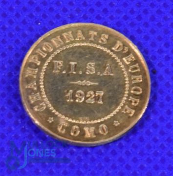 18ct gold FISA European Rowing Championships Medal Como 1927, medal diameter 19mm, weight 3.5gr. The first regatta held as a European Rowing Championships was in 1893 and these continued annually until 1913; the 1914 to 1919 events did not occur due to World War I. The annual schedule was next interrupted in 1928 when the Amsterdam Olympics were regarded as a replacement event; the 1920 Antwerp Olympics or the 1924 Paris Olympics had previously not been a reason for skipping the European Championships. The next time the Olympics were held in Europe, i.e. the 1936 Berlin Olympics, again saw the European Championships skipped. World War II saw the 1939 to 1946 regattas cancelled. The next European event was held in 1947, with subsequent years skipped due to Europe-based Olympics in 1948 (London) and 1952 (Helsinki)