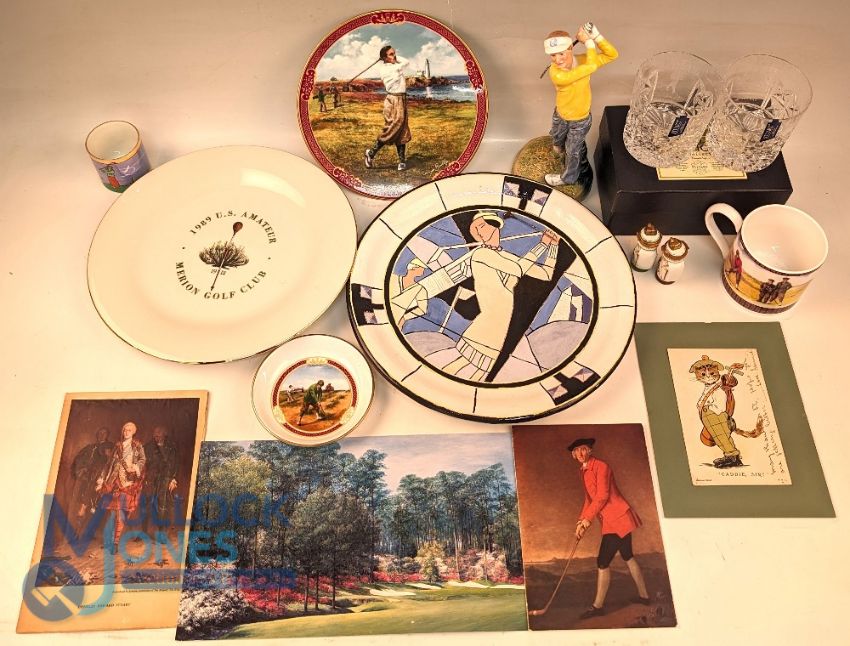 Selection of China and Porcelain Golfing related items: to include Merion Golf Club plate 1989, Abstract plate of a woman golfer, Royal Worcester The Links plate and pin dish, Wedgwood Outdoor Pursuits Golf Mug, Noritake Coffee Can, Stuart Crystal Whisky Tumblers, Royal Doulton Teeing Off Figure, 2 Limoges golf pots (1 Box)