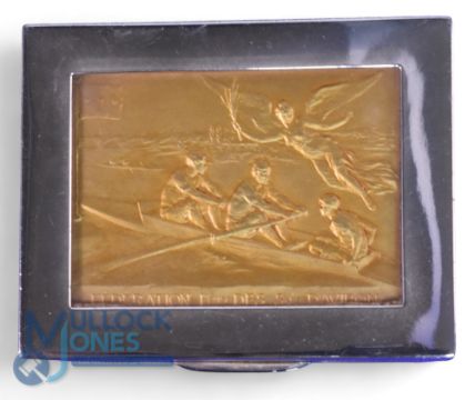 Gilt French Medal/ Plaque mounted in Silver Plated Box. The 1919 Royal Henley Peace Regatta was a key milestone in the sport of rowing and was staged to help heal wounds and hasten the return to normality of the Allied nations and their troops recovering from the First World War. The highlight was The King's Cup, presented by King George V for Allied military crews. Plaque was presented to Colonel Noble 1919; box has RCG engrave to front. 9 x 7 x 3cm