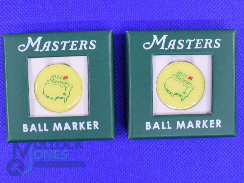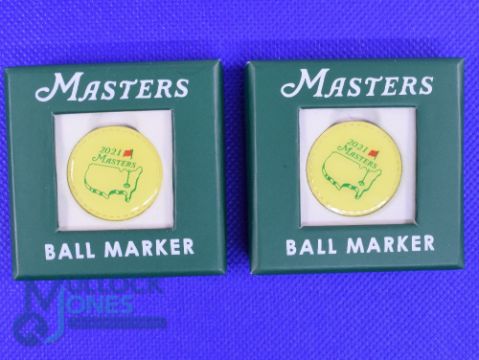 2x 2021 Original US Masters Golf Tournament Enamel and Gilt Ball Markers won by Hideki Matsuyama first ever Japanese Player - in the original Masters box