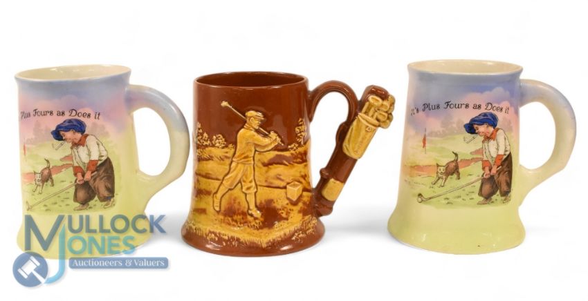 Collection of Period Ceramic Golfing Tankards (6) to incl an original 2x tone Dartmouth Pottery - 1 pint tankard (VG), plus 3x other similar later moulded tankards in including one stamped Cabar Craft Shop, Ullapool Wester Ross; plus 2x "It's Plus Fours as Does it" one pint coloured tankards - good strong colours some minor chips to the one base and visible hairline crack to one handle - nevertheless both very presentable