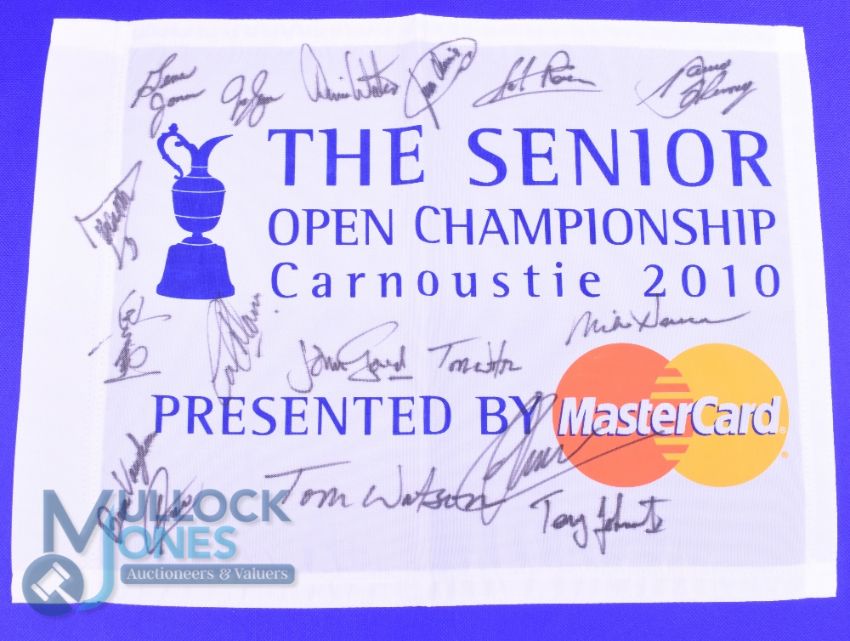 2010 Carnoustie Senior Open Golf Championship profusely signed pin flag - to include major winners Tom Watson, Bruce Vaughan, plus 15x other players incl Tony Johnston et al