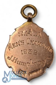 1932 SRA 9ct Gold Sporting Men's Champions Fob Medal, possibly Rifle or Racket Association medal - awarded to J Humphreys, weight 6.5g