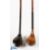 Pair of late scare neck woods incl a Bulger brassie in golden persimmon stamped D M Patrick, with full brass sole plate and a dark stained spoon with indistinct crown makers mark with full oval brass sole plate - fitted with original hide grip with under listing, the other with a replaced grip over the original under listing (2)