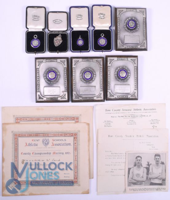 William A Land Athlete Kent County AAA Championships h/m silver sporting medals and trophies. Together with his Kent Schools Certificate and Silver medal 1926 Land was the 1932 high jump AAA champion. He competed in the discus throw and high jump at the 1934 British Empire Games. Land also held the British javelin throw record in 1935 (total weight 40.3g)