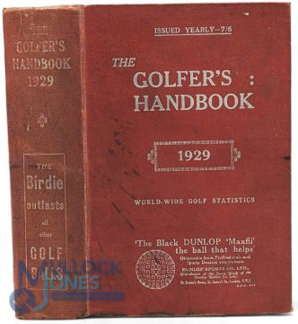 The Golfers Handbook & Year Book 1929 - illustrated with photographs and advertisements, red cloth cover, the boards have signs of repair to spine - white lettering and decoration to cover and spine - The Golfer's Handbook 1929, F-G