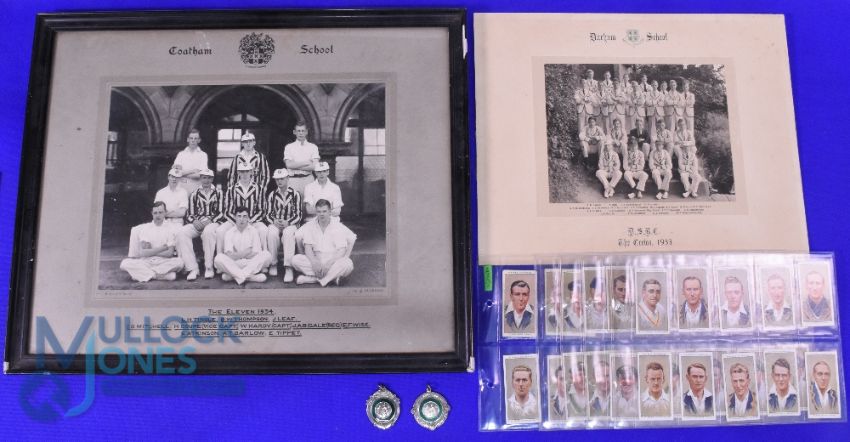 Cricket Photographs. 1934 Coatham School f & g 48 x 38cm, Durham School 36 x 28cm together with 1934 John Players Cigarettes Cricketers, cricket medals Thixendale Cup 1961 (5)