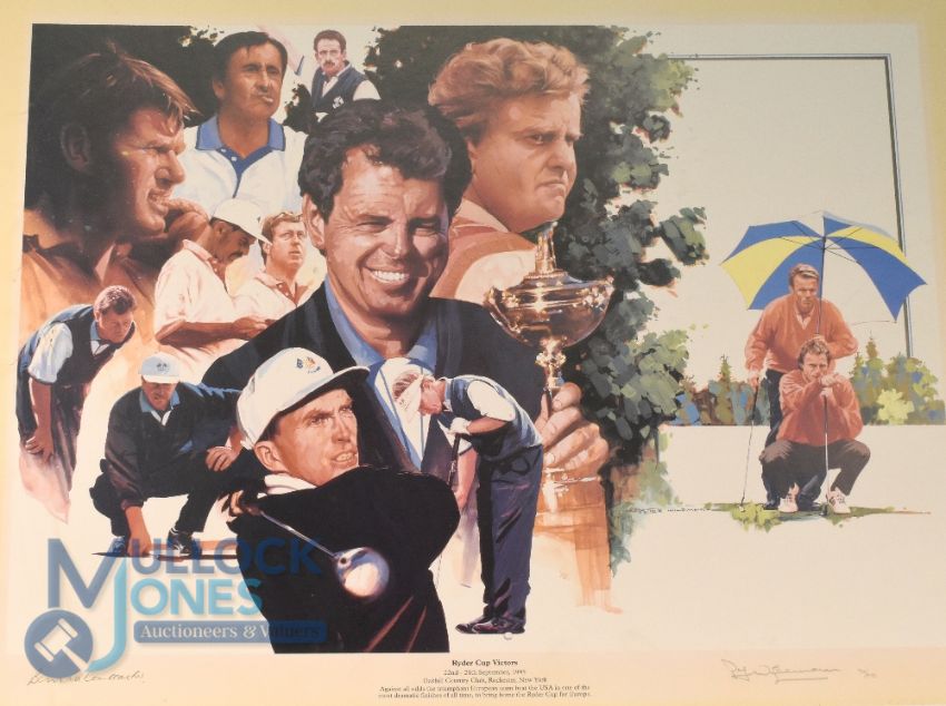 1995 European Ryder Cup signed ltd ed colour print titled "Ryder Cup Victors" played at Oakhill Country Club Rochester New York signed by both the artist Peter Wileman and European Captain Bernard Gallacher, won by the Europeans for only the 2nd time on US soil - ltd ed no. 74/795 - mounted on board and ready for framing overall 20" x 27"