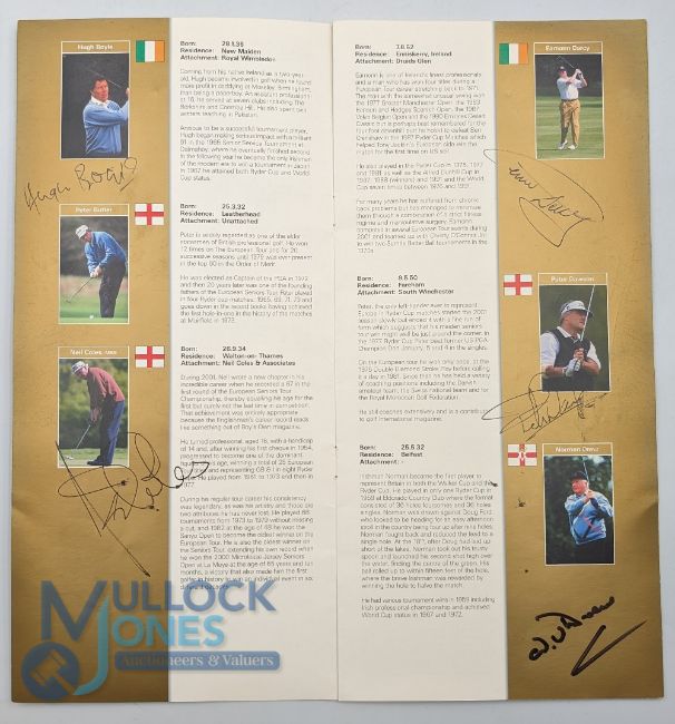 2002 Legends of the Ryder Cup multi signed Golf Tribute card, with signatures of M Faulkner, Harry Bannerman, Brian Barnes, Maurice Bembridge, Hugh Boyle, Neil Coles, Eamonn Darcy, Peter Dawson, Norman Drew, John Gardner, Malcomb Gregson, Tommy Horton, Brian Huggett, Bernard Hunt, John Jacobs, Christy Patrick O'Connor, Christy O'Connor, Lionel Pratt, Eddie Polland, Peter Townsend, Paul Way, George Will, Norman Wood - a good selection