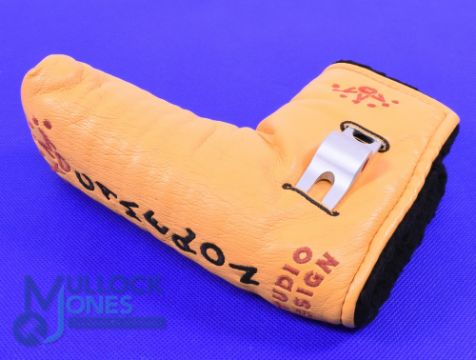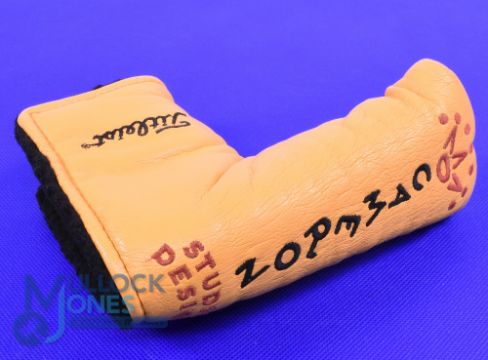 Interesting Scotty Cameron "Studio Design" leather embroidered head cover complete with pitch repairing Fork - pitcher repairer stamped "Scotty Cameron Studio Design Titleist Pat Pend USA" with the classic maroon coloured dot markings to each side - unused