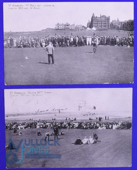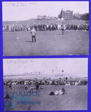 2x interesting 1905 Open Golf Championship St Andrews postcards - one of the '1st hole' with both J H Taylor and James Braid on the 1st Green surrounded by a large crowd of spectators and written in pencil on the back Braid v Taylor, unused; together with another similar scene on the 18th green with J H Taylor putting - used and dated 7th June again handwritten in pencil J H Taylor putting