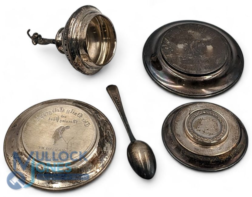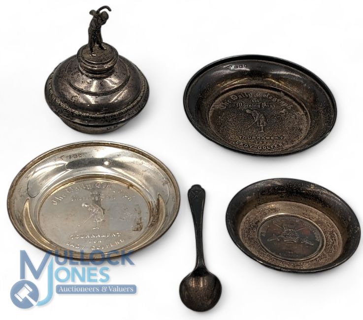 Silver Hallmarked Golf Collectables, to include a silver teaspoon, a trophy top with golfing figure 2 Daily mirror and morning post Tournament for ladies golf c1938, an Army Golfing Society Ordnance cup winner 1961, Sandwich silver pin dish with an inset plated medal, total weight including the plated medal 210g
