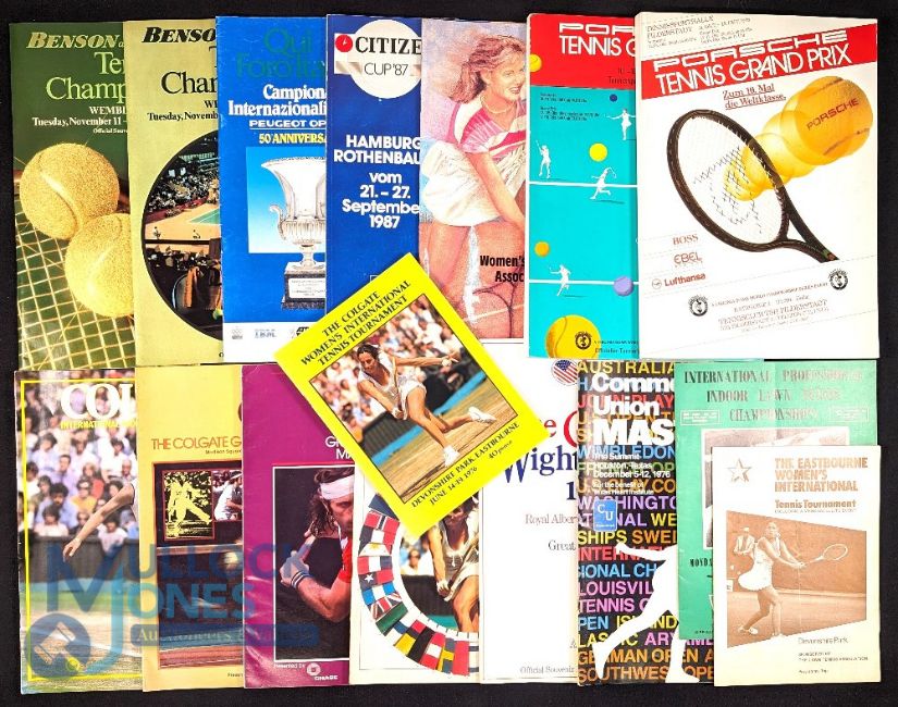 Selection of Tennis Programmes. Official programmes to include Wembley 1967, Women's International 1975, 1976, 1979 Union Masters 1976, Wightman Cup 1978, Federation Cup 1977, Master's 1978, 1979, Porsche Grand Prix 1986, 1987, Women's International Florida 1987, Citizen Cup 1987, Qui Foro Italico 1993 - results very neatly written in all programmes and in flat condition with no folds (13)