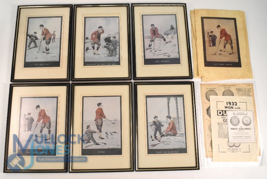 7x Period Edmund Fuller Golf humorous Prints: 7 good framed images of the first drive, the last drive, fore, the bunker, entitled to see the ball, the last put, clean your clubs sir, plus a repeated collection of 7 loose prints, and 3 golf ball adverts taken from magazines