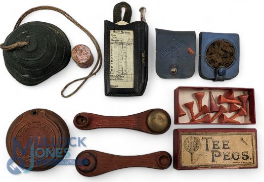 Golf Collectables: to include period golf ball cleaners - one with a loose rubber part, 2x rubber star tees, leather score card, golf tee holder, a good early tee peg with 12 wooden tees inside, a box of rubber plaster
