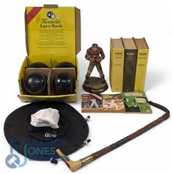 Mixed Sporting related items. To include Wisden Anthology 1940-1963, 1963-1982, Book of Test Cricket 1877-1984, Playfair Cricket Annual 1983, 1988, bone handled Riding Crop, Australian Guinness hat, Henselite Lawn Bowls, The Gentle Touch rugby figure (box)
