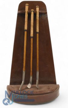 Interesting Collection of Miniature Handmade late 18thc Irons to incl Cleek, Lofting Iron and a Track Iron c/w hide grips and mounted on dark stained wooden display stand - overall 11.5"h