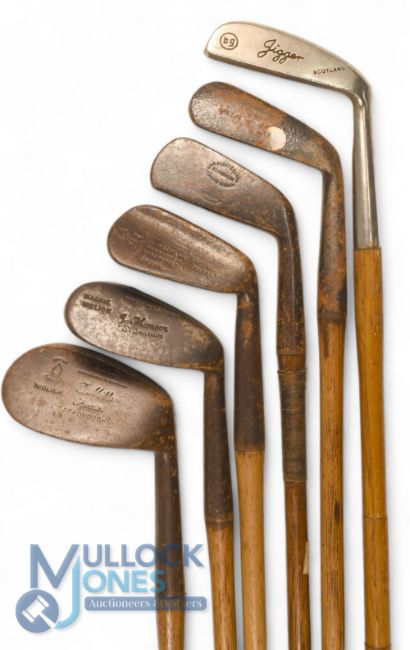 6x Assorted irons to incl dreadnought niblick showing the Mitre brand, flanged sole Gibson special mashie, round back jigger, D&W Anderson long iron, and a Bronty golf wide soled jigger (modern) - 3x without grips