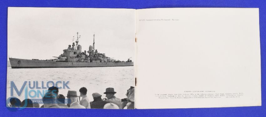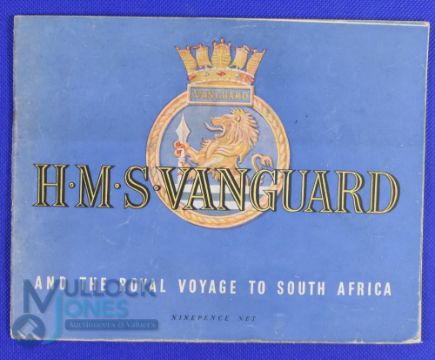 Souvenir Of HMS Vanguard and The Royal Voyage To South Africa 1946-47 - A fine 32 page Souvenir publication with 28 photographs of this last Battleship that Britain constructed. Showing views of Princess Elizabeth visiting the Ship, Views of the ship, her 15" Guns, Engine room, Officers and Sailors quarters. Also the Royal State Rooms for the King, Queen and Princesses for Royal Tour to South Africa that year. Published just before the Royal Tour. Printed on fine semi-gloss paper in card cover, size 7.75" x 6". (HMS Vanguard; Launched November 30th 1944, tonnage 42,500 tons, Main Armament Eight 15" Guns. This Souvenir publication was sold in the NAFFI on board the ship)
