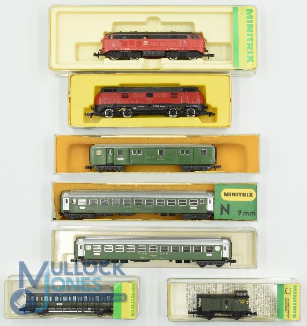N Gauge Model Railway - Minitrix German DB to include Locomotive 12873 damage front, Arnold Rapido 0202, Swiss Coaches 13028, 13026, 13026, 13302, 13200 all boxed (please note Loco has not been tested) (7)