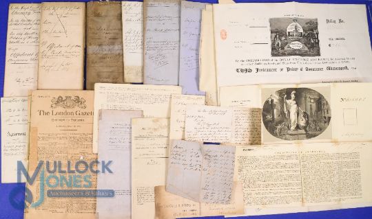Ephemera: good selection including a bundle of legal indentures, leases etc, mostly 19th c, some attractive fire insurance certificates, an 1891 copy of the London Gazette