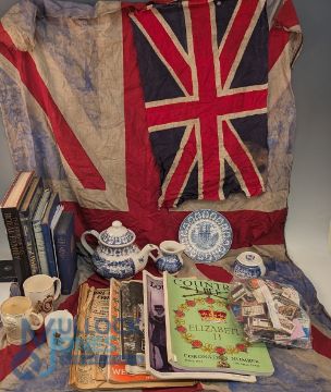 Royal Family Royalty Collectibles: to include a 22-piece full set of Broadhurst 1997 the Queen Silver Jubilee Westminster Abbey tea set - cup, saucer, teapot - in original box unused, 2 vintage Union Jack flags, Coronation mugs for 1911, 1953, Royal Wedding books, newspapers magazines, plus a selection of matchboxes