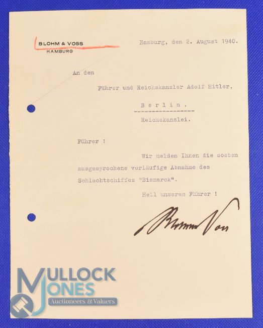World War II - Letter by the Blohm & Voss Shipbuilding Company to Adolf Hitler, Aug 02, 1940 - "Fuehrer, we are reporting to you the preliminary technical acceptance for the battleship Bismarck, Heil to our Fuehrer, Blohm Voss" - printed and signed in ink. Provenance: found by locals at Hitlers Berghof Obersalzberg in 1945