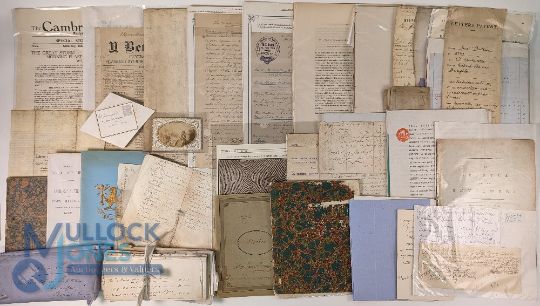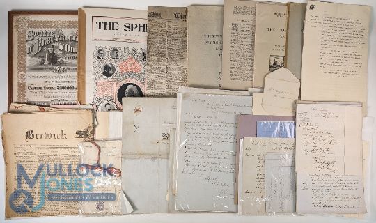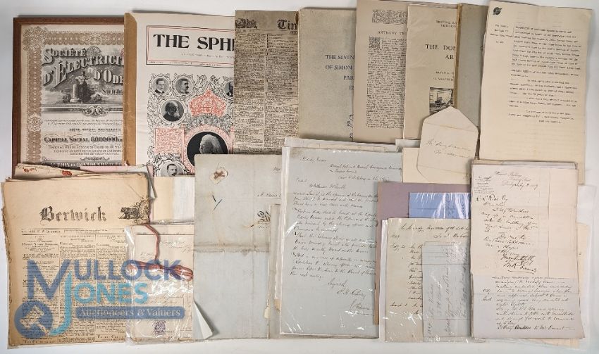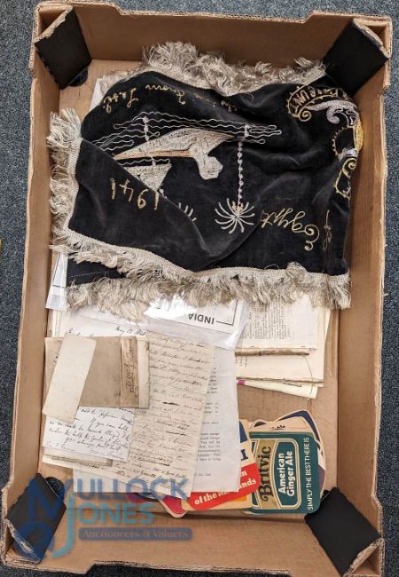 Ephemera: A large box of miscellaneous manuscript and printed items, many 18th and 19th century, including Special Storm edition of Cambrian News, Aberystwyth 1938, large hand coloured estate map 19th c