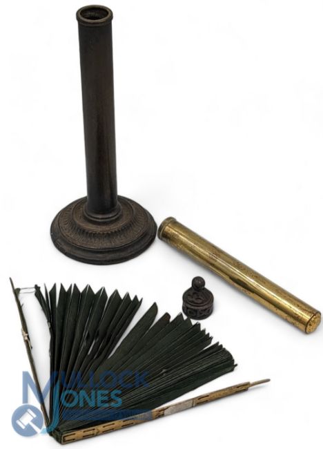 Victorian 'Days Patent' Portable Screw Top Brass Fan Stand with Concealed Fan. Concealed with a brass tube which slides into a metal stand normally for Chimney ornaments. English Gothic "Chimney Ornaments". Used to protect a lady's make-up from the heat of the fireplace c1830-1840. The shafts are telescopic, and each contains a folded silk sheet which opens out to make a small circular screen (10" diameter). The brass mounts were fitted into the top of the shaft. Maker: Underneath the foot is a label which reads Days patent. Manufactured by Patentee, Snow Hill, Birmingham