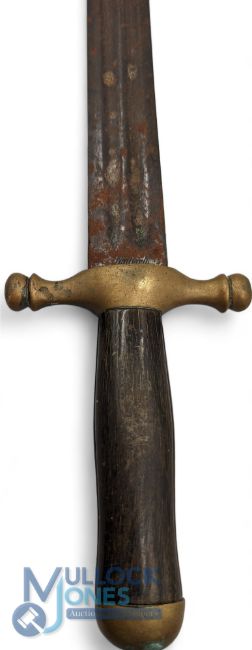 Continental Period Sword, with grip wooden handle, brass pommel, and rain guard, has indistinctive markings to blade -62cm long. COLLECTION ONLY