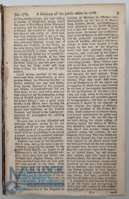 The Scots Magazine 1769: Bound volume of monthly issues, lacks front board and first leaf of January. Folding plate of a canal and locks with boats