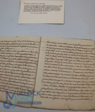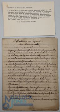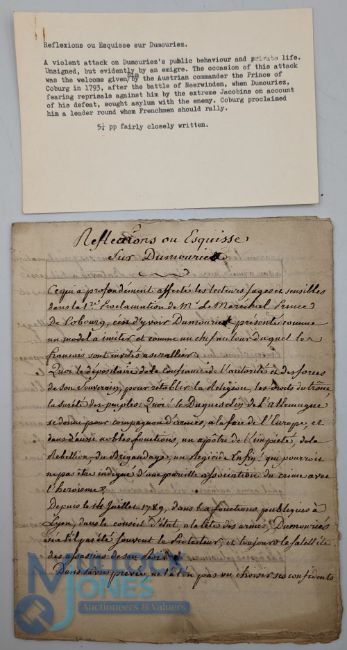 French Revolution - [Charles Francois Dumouriez] Réflexions ou Esquisse sur Dumouriez - ms in ink on 6pp sm 4to, no date but probably 1793 being a violent attack on Dumouriez, the French military general who won several decisive battles during the French Revolution, but then traitorously deserted to Austria. The manuscript deals with his defection to the Duke of Coburn on the Austrian side at the height of the Revolution. An important historical document relating to the Revolution.