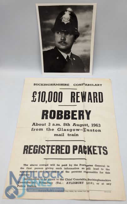 The Great Train Robbery Original Poster from Buckinghamshire Constabulary, detailing £10,000 reward, with a photograph of PC492 J R Kirkman of West Riding Constabulary 1953-1967 who kept this original reward poster for the Great Train Robbery - of exceptional rarity. The present example has folds and one hole to the middle but is otherwise in good condition. Size 37cm x 28.5cm