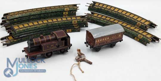 Bing Tabletop LMS 3303 Tinplate Train Set, the locomotive has a broken spring and need some repair, comes with its key, one LMs 3rd coach and a selection of curved tabletop track