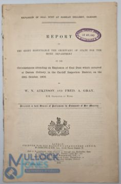 Glamorganshire - Darrem Colliery Disaster 1909: Official report into an explosion of coal dust in which 27 men were killed and 3 men of the rescue team. A list of names, age and occupation etc. 13pp folio plus full page coloured Plan of the Workings showing sites of the bodies. HMSO 1910