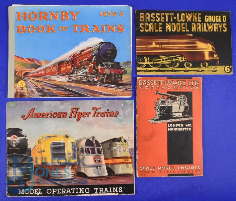 Model Railway Catalogues (4) to include: American Flyer Trains 1936 - A large impressive 42 page mostly multicoloured catalogue illustrating various Electric Train Sets plus Locomotives, coaches and various accessories etc., with details and prices. Printed on semi-gloss paper in illustrated card cover, size 11.25" x 8.5". Hornby Book of Trains 1932-3. A large impressive 48 page mostly multicoloured catalogue illustrating various Clockwork and Electric Train Sets plus Locomotives, coaches and various accessories etc., with details and prices. Printed on semi-gloss paper in illustrated card cover, size 11" x 8.25", Bassett - Lowke Ltd Northampton. Scale Model Engines 1934. A 90 well illustrated page catalogue with extensive detailed specifications and prices of Live Steam Traction Engines and other stationary engines and component parts etc Printed on semi-gloss paper in illustrated card cover, size 6" x 9" and Bassett-Lowke O Gauge Scale Model Railways. 1940/1 - very scarce War Time 44 page very well illustrated catalogue detailed with prices their existing stock of model, locomotives, carriages, track etc, having gone over to war time production. Printed on utility paper on pictorial card cover, size 9"
