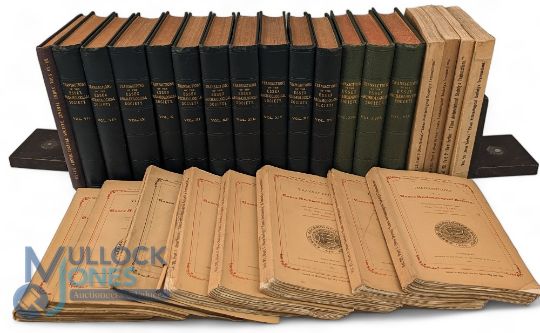 Essex Archaeological Society Transactions: - vol. VII (1900) to Vol. 25 (1960) complete. Vols. VII-XIX bound in green cloth, gilt, others in printed card covers. Index vol. VI-XV bound in blue cloth. Hundreds of plates and illustrations