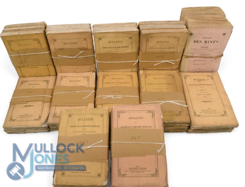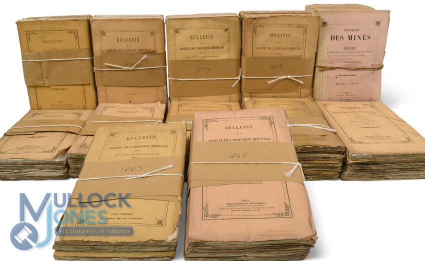 Mines & Minerals Bulletin de la Société de l'Industrie Minérale. Paris 1863/4 and 1884, 40 issues, printed card covers. Uncut Annales des Mines. Paris 1879 3 vols. Many fine plates, maps and sections, printed card covers. Uncut (qty in box)
