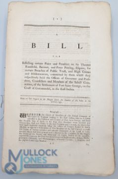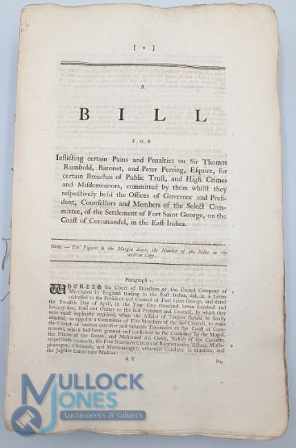 India – Sir Thomas Rumbold – A Bill for inflicting certain pains and penalties on Sir Thomas Rumbold…together with Minutes of the Evidence and the proceedings in the House of Commons, when Rumbold was impeached.1783 Large folio approx. 560pp. A remarkable case in which Rumbold, former Governor of Madras, was impeached for corruption and bribery. Rumbold is infamous in the history of India for his time as Governor, being involved in various high profile thefts of important Indian treasures including the Ring of the Nawab of Arcot – worth over £1million. Rumbold bribed his way into parliament being elected MP for Shaftesbury after paying each elector about £20 to vote for him. His dissolute life then continued in India where he was accused of in effect causing the second Anglo-Mysore war. The present document contains undoubtedly the most comprehensive information on Rumbold and his involvement in India and should provide researchers with invaluable material.