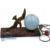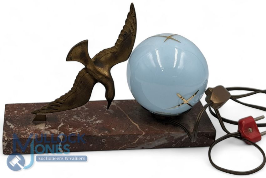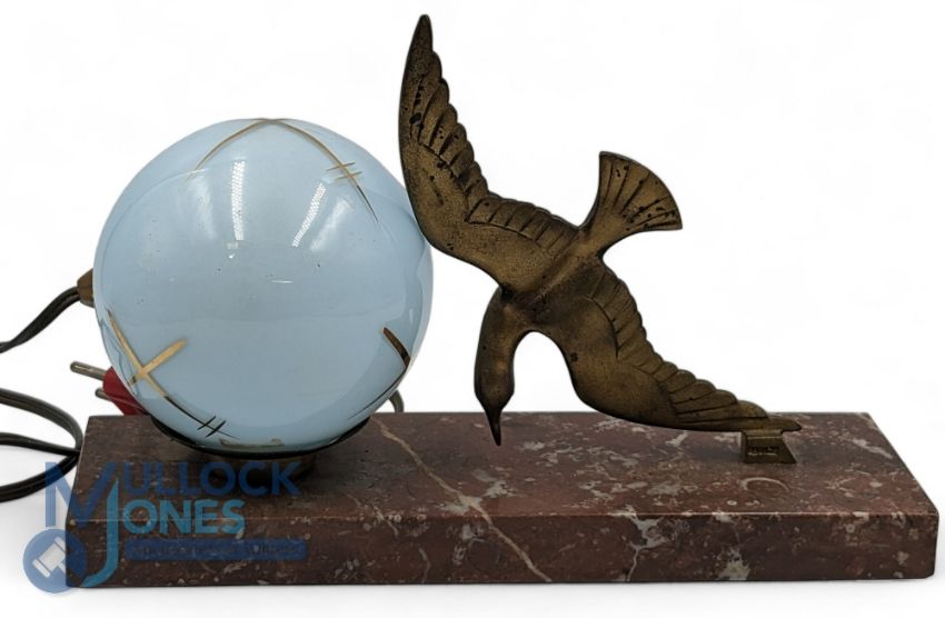 French Art Dec Bronze Diving Bird Lamp, on marble base, with a light blue glass globe shade, in need of re-wiring, still has a French 2 pin socket on it. G