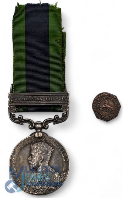 A George V Indian General Service Medal with Waziristan 1919-21 Clasp to 63778 PTE Enos Pidgeon CN, R WAR R, with his Sankey Works badge also named