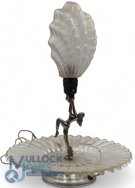 Art Deco Dancing Lady Lamp. Chrome plated lady standing on a fan design glass base having a glass shell lamp shade (Please consult a qualified Electrician before using)