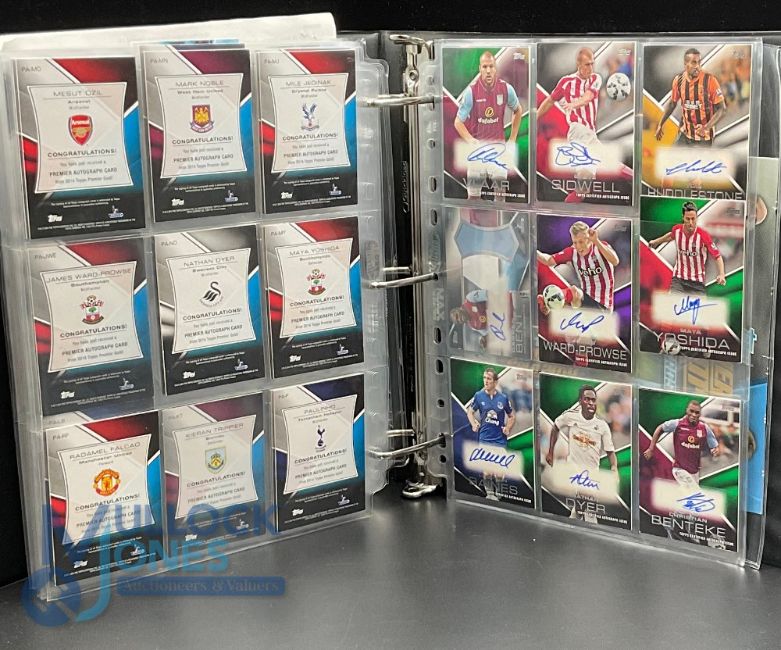 Topps Premier Gold Soccer Cards 2014 with 31 Relic Cards Player worn shirt samples and 31 Signed cards Adam Lallana, Andre Wisdom, Ben Davies, Darren Bent, Bobby Zamora, Diego Costa, Fabian Delph, Fraser Forster, Joe Cole, Jack Coleback, James Ward-Prowse, Kasper Schmeichel, Kieran Trippier, Leighton Baines, Mile Jedinak, Mark Noble, Mesut Ozil, Maya Yoshida, Nathan Dyer, Paulinho, Radamel Falcao, Ron Vlaar, Steve Sidwell, Tom Huddlestone, Christian Benteke in an Ultra Pro Collectors Album