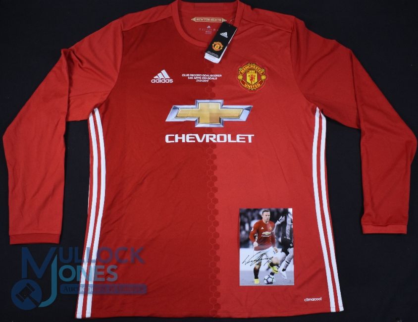 Manchester United FC home football shirt 2016-2017 #10 Rooney, Club Record Goalscorer, Size XL, Adidas / Chevrolet, red, log sleeves with tags and a pre-printed signed Wayne Rooney photograph