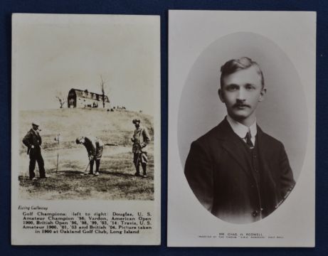 2x Interesting Early Players golfing postcards - one featuring 3x "Golf Champions" taken in 1900 at Oakland Golf Club Long Island to incl Douglas, US Amateur Champion 98; Vardon American Open and British Open champion and Travis US Amateur and British Amateur Champion; and another half length portrait of Mr Chas H Rodwell inventor of the famous "G M D Namesake" Golf Ball (from J H Taylor's own archive-hand written in pencil on the reverse) - both unused